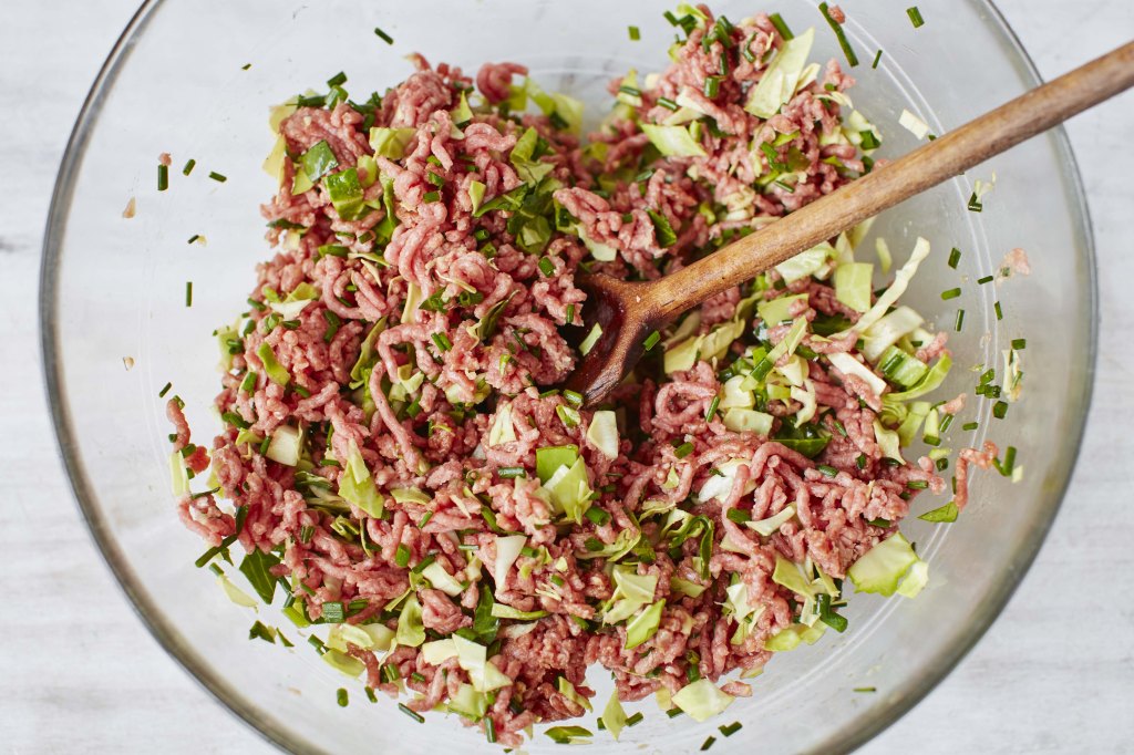 When making the filling mix together all of these in a bowl and spend 10-15min thoroughly mixing the meat. Special Hint 1: The more you mix the filling the better it will taste. Mixing the meat helps combine the fat making the meat much tastier. Special Hint 2: Soak the cabbage in salt with a bit of water and squeeze it. You don’t want the cabbage sitting in water but you do want it damp and slightly salty. The salt helps suck out the moisture in the cabbage and wringing it dry will get rid of all that moisture. If you don’t do this your dumplings may have watery instead of juicy fillings greatly diluting the taste.
